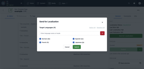 Now that you’re ready to send in content for translation, let’s get started! Simply select untranslated content within Contentful and click “Send for Localization”. From there, you can select which languages you want translations for. Keep track of progress or cancel localization requests at any time.