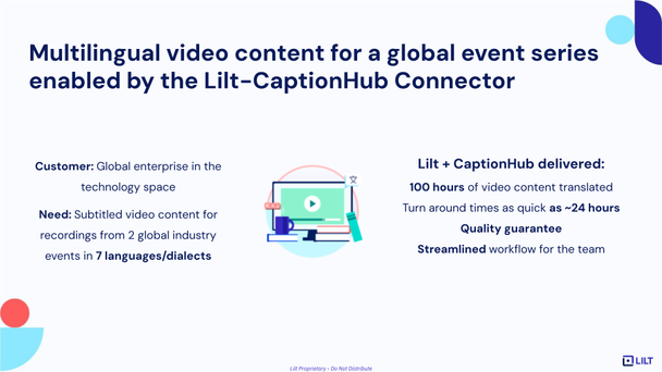 With the right technologies in place, businesses can produce relevant video content quickly and efficiently, helping them to engage customers and build relationships. Through our collaborative approach to video content localization with CaptionHub, our AI-based technologies greatly improve the speed and accuracy of translating and subtitling services. To learn more about how CaptionHub and LILT's integrated services can handle large volumes of video content, automate processes, and improve the accuracy of translations over time, watch our full webinar on-demand.