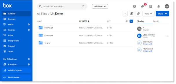 At BoxWorks, we demonstrated how the LILT <> Box Connector (pictured below) enables seamless, automated, and instantaneous content exchange.