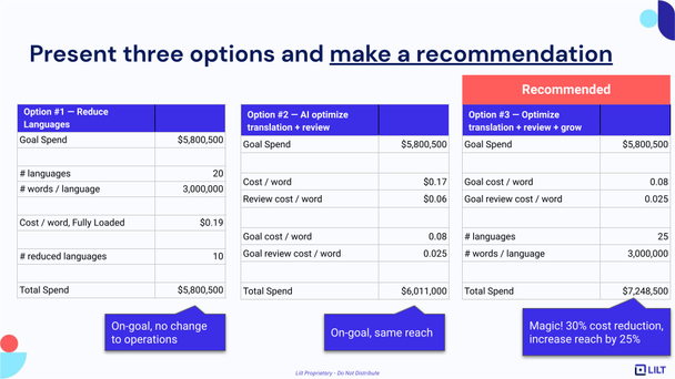 Green then dived into a case study in which AI translation can optimize ROI. When faced with a directive from management to reduce the budget for the localization department by 50% using AI, Green proposed three different strategies.
